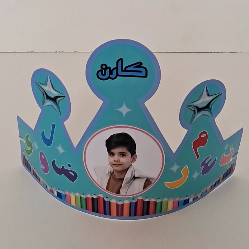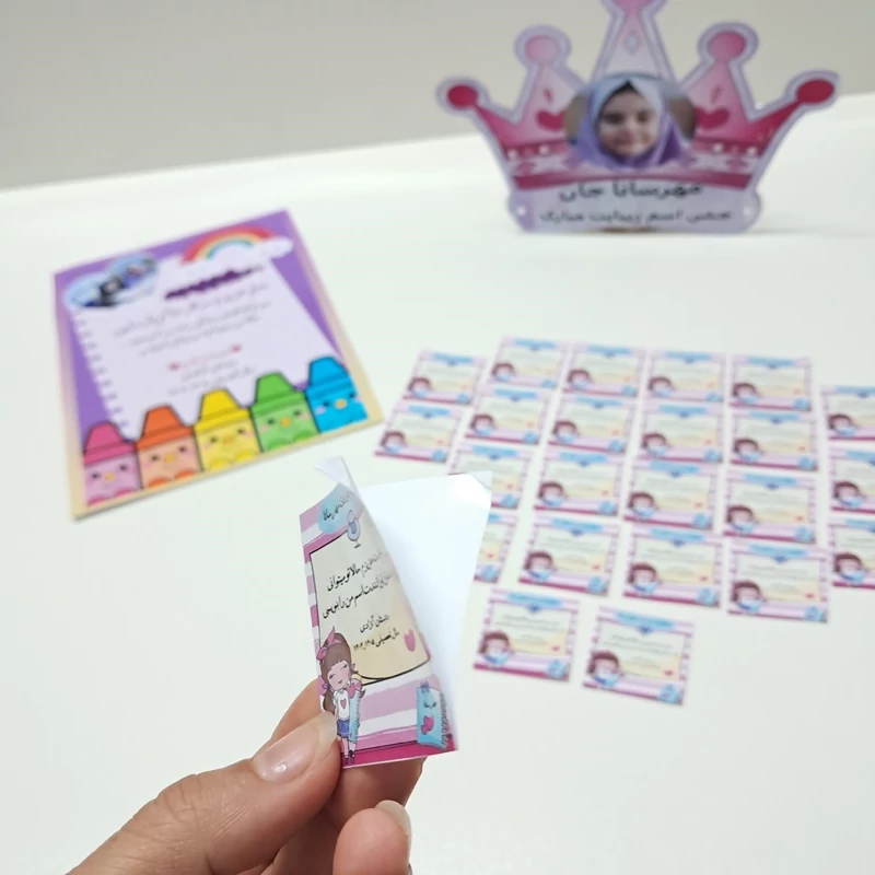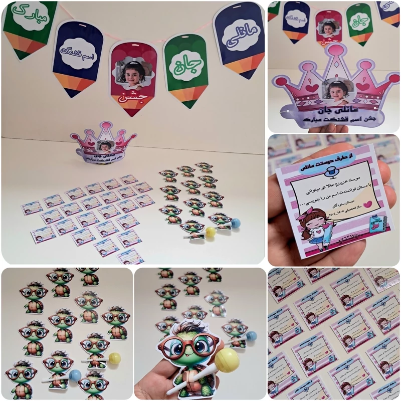 تاج ،ریسه، لیبل چسبدار، تقدیرنامه از معلم ،جاسوئیچی،تاپر الفبا و....