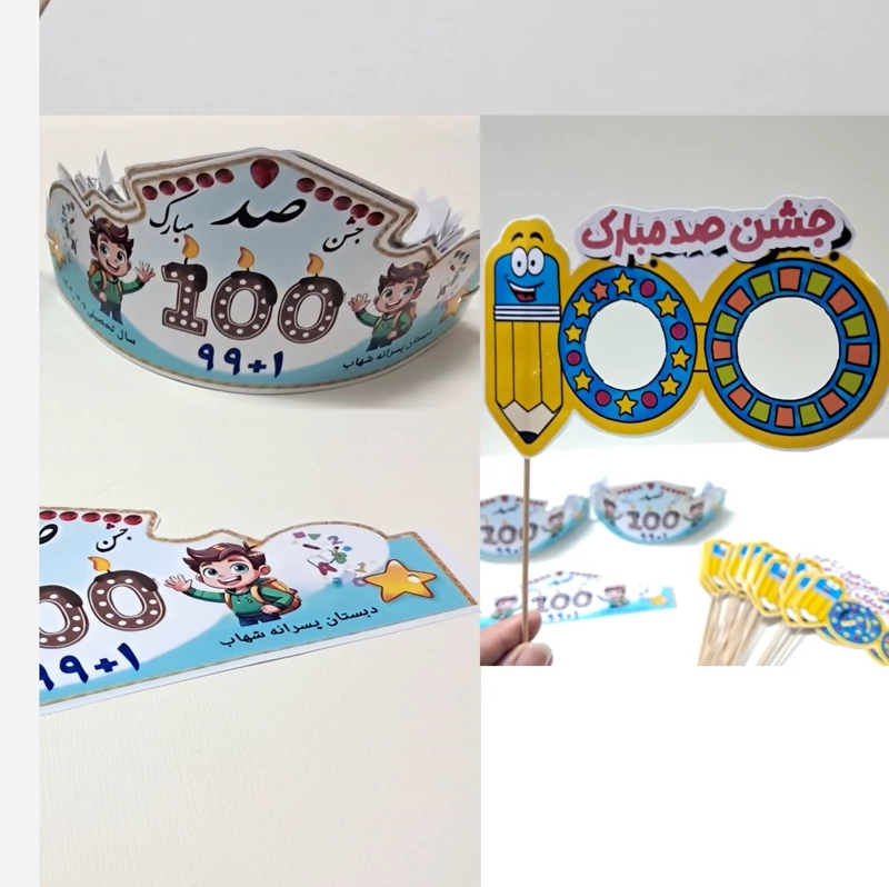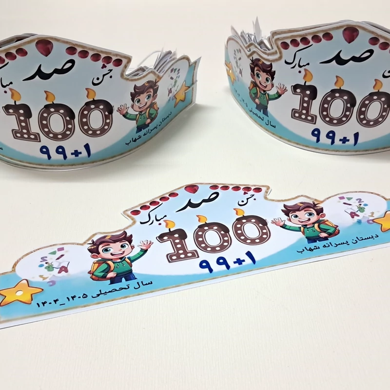 تاج جشن 100 ✅️جنس کار گلاسه ✅️پشت تاج کشدار جهت فیکس شدن ✅️قابلیت چاپ نام مدرسه و کلاس و معلم 📌قیمت هر عدد 25 ت 📌 قیمت برای تعداد بالاتر هر عدد 20 ت