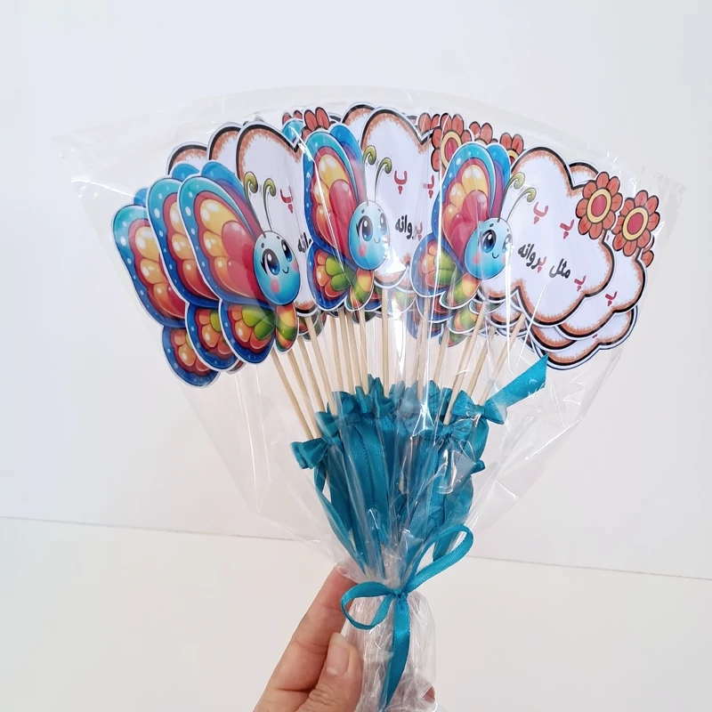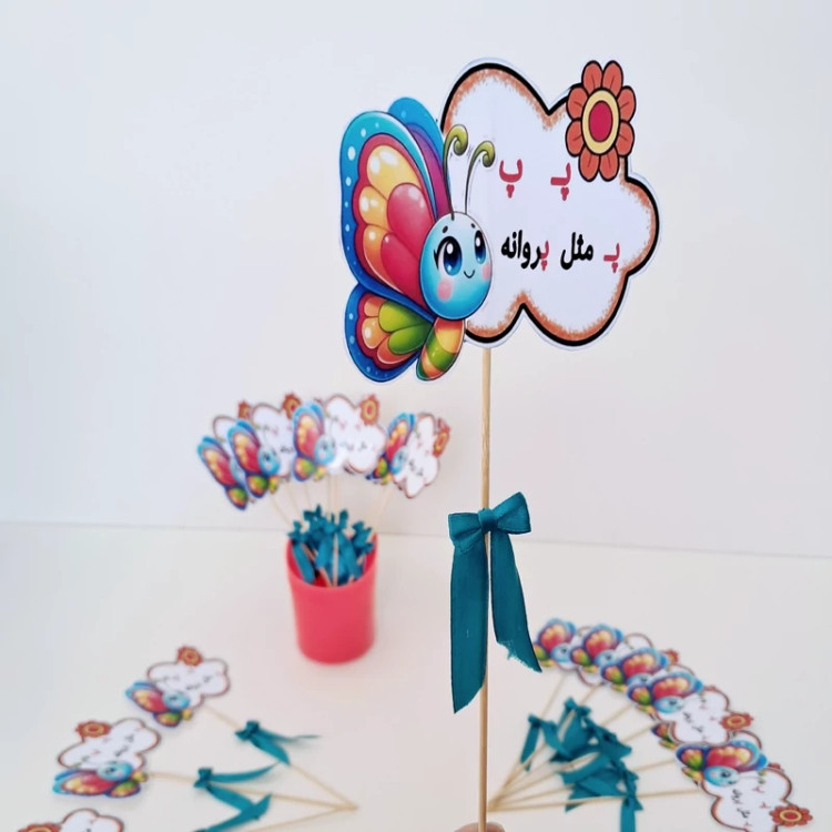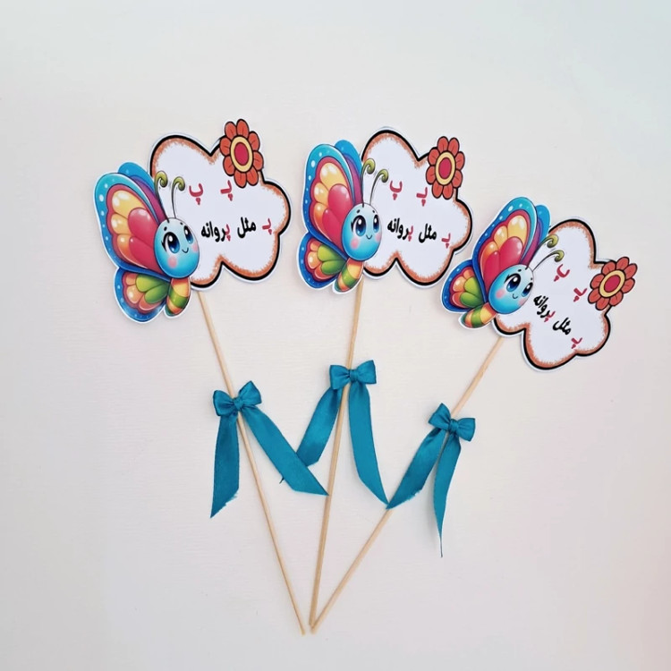 تاپرِ نشانه ی (پ) طرح پروانه ✅️قابل سفارش برای تمام حروف الفبا ✅️جنس کار مقوای گلاسه ✅️چاپ رنگی با کیفیت 📌 قیمت هر عدد 12ت ❌️حداقل تعداد قابل سفارش 10 عدد❌️